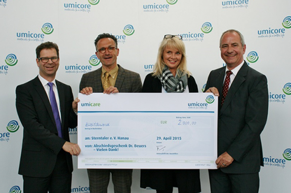 Hanau, 30. April. Staffelübergabe bei der Umicore AG & Co. KG: Im Rahmen der Veranstaltung "Innovation am Abend" verabschiedete sich Dr. Jörg Beuers, Vorstandsvorsitzender, in den Ruhestand und übergab sein Amt an seinen Nachfolger Dr. Bernhard Fuchs.